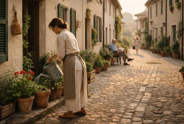 Intorno a casa, il paesaggio non è mai spettacolare. Ed è proprio questo il suo valore. Non distrae, non chiede attenzione, ma accompagna. Campi, strade, case basse, cortili, piccoli spazi di passaggio. Tutto è a misura d’uomo, e questo rende i cambiamenti più percepibili. Un albero che cambia colore, un giardino più curato, un angolo che torna a essere vissuto.